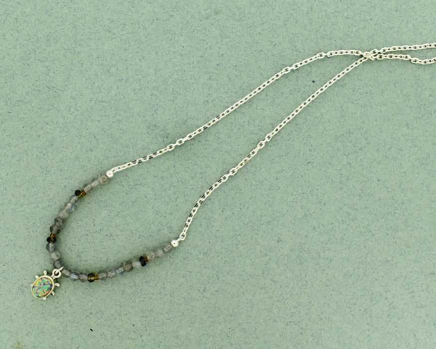 Elevate your elegance with this Labradorite and Opal Silver Chain Necklace, featuring a Grey Green Opal Pendant, silver chain that beautifully complements the shimmering labradorite stones. This sophisticated piece offers a subtle play of color and light, perfect for adding a touch of timeless charm to any ensemble. 17" and 2" extension chain.