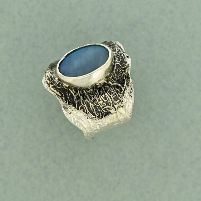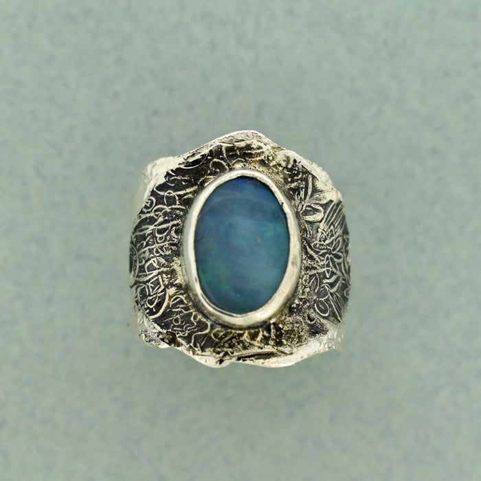 This Large Blue Opal Ring features a striking, vibrant opal centerpiece set on a distressed, textured silver band. The unique finish of the band enhances the stone’s natural beauty, offering a sophisticated yet bold statement piece. Expertly crafted, this ring combines artisanal design with durable materials, making it an exceptional addition to any jewelry collection.