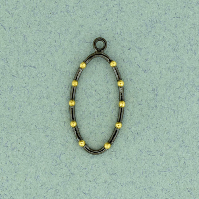 Unusual new component made with oxidized sterling silver with bright gold dots and a loop,   27x12mm or 1 1/8" height, 1/2" across